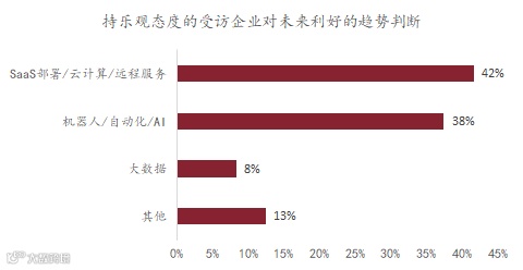 看好未来发展的两大逻辑在于:新习惯的用户教育和重点领域的补短板。综合各受访企业的反馈,我们认为以下趋势值得关注:云化、在线化、远程化,机器智能辅助或替代人工,智慧基础设施建设。