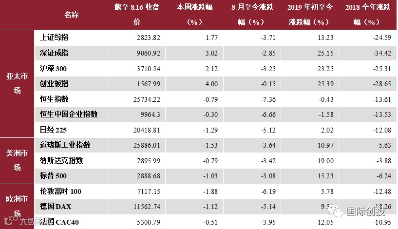 国内市场方面,中美贸易问题再现转机,8月13日晚中方就美方拟于9月1日对中国输美商品加征关税问题进行了严正交涉,双方约定在未来两周内再次通话,这一消息使得市场风险情绪得到一定回升。但在周四晚间,美方突然宣布将对3000亿美元自华商品加征10%关税,导致欧美股市急转直下,又因美债收益率曲线倒挂引发经济衰退担忧,避险情绪重燃,道指跌逾800点创年内最大单日跌幅。