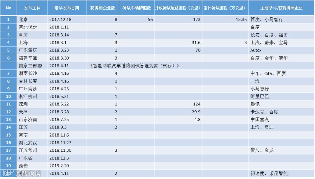 2019年4月前,已有19个城市/省份发布自动驾驶测试地方政策。4月11日,第20个城市苏州隆重登场,初速度(苏州)科技有限公司、苏州禾昆智能科技有限公司获得苏州首批测试牌照。