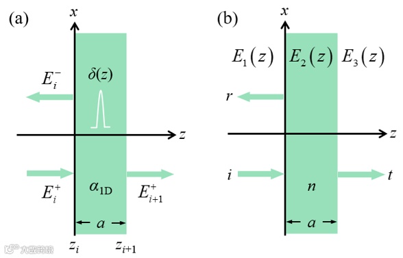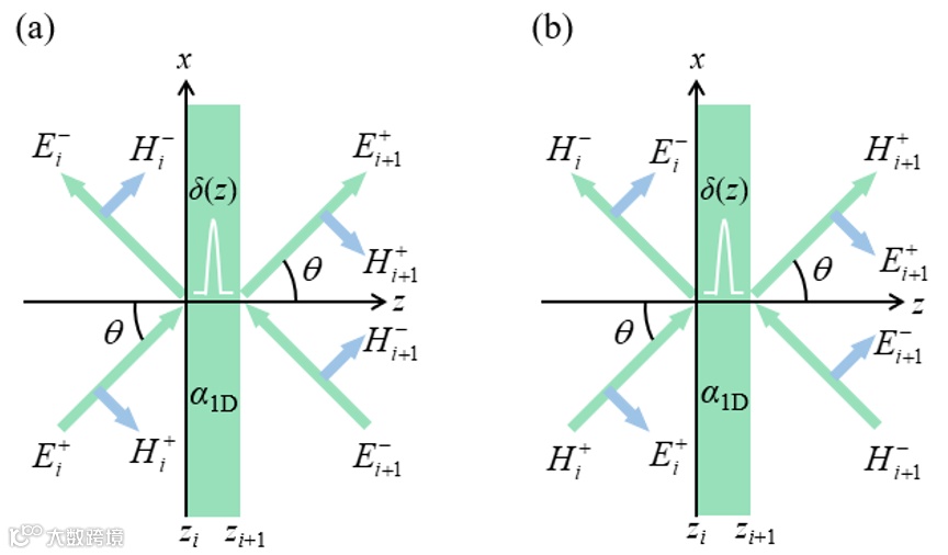 图4. (a) TE 偏振光相对于原子层以任意角度斜入射的情况。(b) TM 偏振光相对于原子层以任意角度斜入射的情况。在这两种情况下,入射角为 θ且等于折射角,整个模型可以看作二维光学问题。