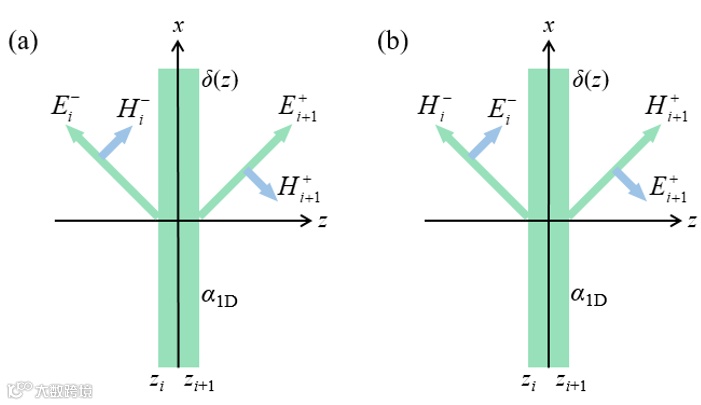 图四 在传递矩阵法的框架内,通过δ函数极化电荷和表面电流表示光通过单原子层传播的示意图