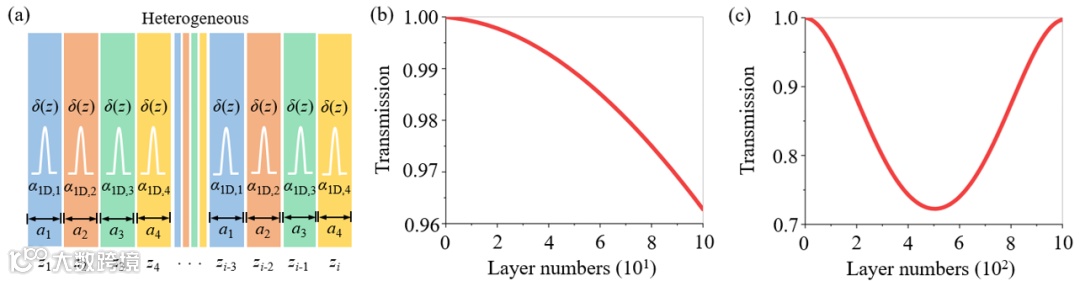 图8. (a) 异质介质示意图。一个周期内有四个不同的原子层。它们原子层的厚度分别为