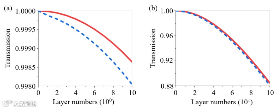 图6. 红色实线和蓝色虚线分别由经典光学理论和原子尺度理论计算得出。图中(a)和(b)为不同层数的透射光谱:(a) 0-10层,(b) 0-100层。单原子层厚度为0.375 nm,原子极化率为1.82 nm,入射波长为1550nm。
