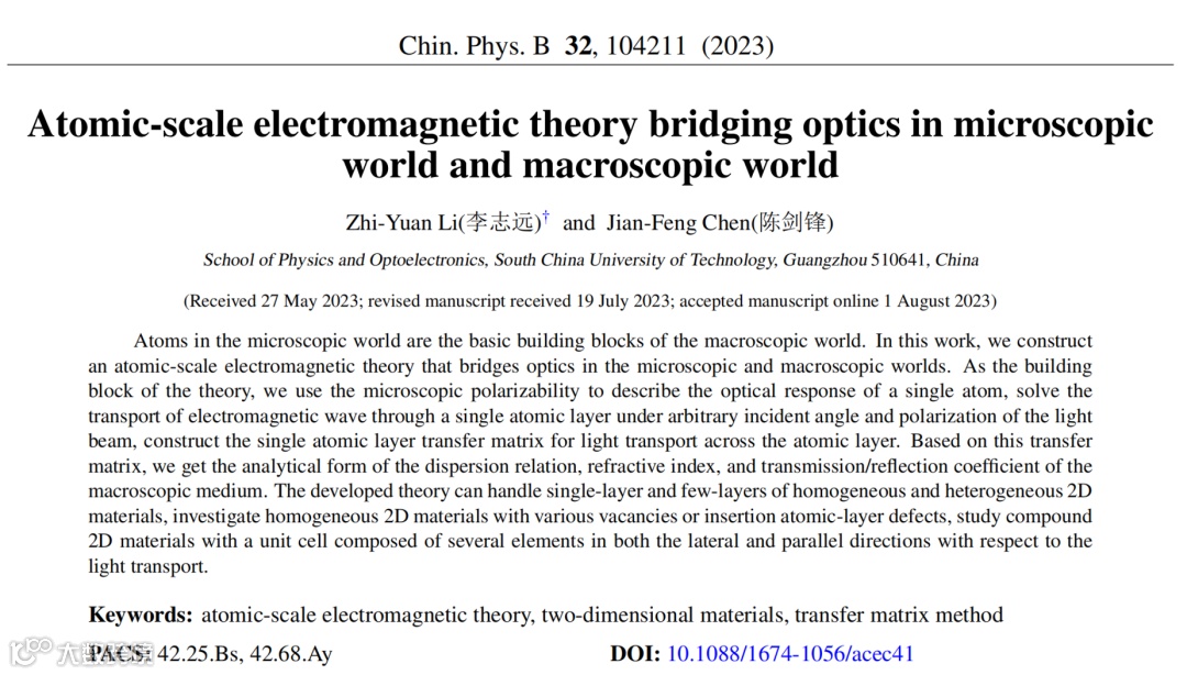 通过麦克斯韦方程组求解传统的光学问题需要知道介电常数和折射率这些物理参数,然而,对于厚度远小于光波长的纳米结构和二维材料而言,折射率和介电常数并非好的物理参数。因此,原子尺度电磁理论提供了一个超越以连续介质麦克斯韦方程组为核心的经典光学、电磁学和电动力学的理论范例。值得指出的是,该理论还可以拓展,处理二维和三维纳米颗粒和纳米器件等微纳尺度光学问题。目前的理论研究成果将为进一步建立一整套宏观和微观、经典和量子相统一的光和物质相互作用理论,为进一步构建契合原子尺度光场传播和演化行为、超越连续介质麦克斯韦方程组所描述的电磁场传播和演化行为的电磁学、电动力学和光学理论体系提供了扎实的研究基础和有益思路,并有望为推进这个物理学重大基础问题的进一步深入研究及其最终解决开辟了一条行之有效的路线图。该理论研究成果近期已发表在一篇20页长篇论文Chin. Phys. B 32, 104211 (1-20)(2023)上。另外,为方便国内读者更好的阅读理解,准确地获取精细的物理思想和数学处理方法,李志远教授和几位学生陈剑锋、纪子韬和张简智花费了大量精力将该英文论文翻译成中文文本。同时,中文长篇论文也对英文文章中因期刊编排和作者审校等等原因所造成的一些印刷文字和图表差错做了详细的勘误和更正,以期更加完整、更加准确地将该原子尺度电磁理论呈现给读者。英文版的期刊论文和中文翻译论文的电子版PDF文件一并可以下载,对于年轻读者来说,两者对照阅读,效果更佳,还是母语交流方便顺遂啊!在此,感谢两江评论这个交流平台。(扫描下方二维码即可查阅)