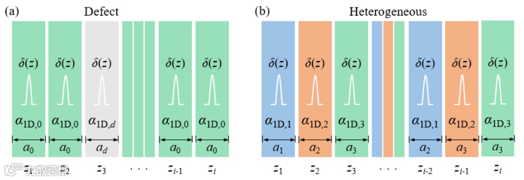 图3. (a) 含原子层缺陷(灰色区域)的均匀介质(绿色区域)示意图。(b) 异质介质示意图。一个周期内有三个不同的原子层(蓝色、橙色和绿色区域)。