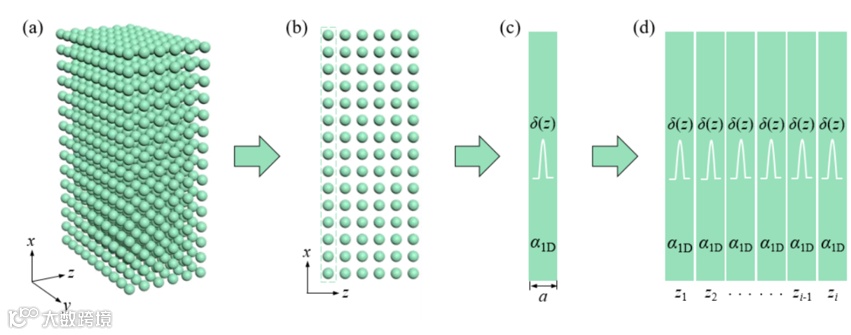 图1. (a) 宏观光学晶体介质,由真空中的离散原子作为基本构件三维堆叠构成。(b) 沿着光的传输方向,这种介质可被视为由单个原子层一维周期性堆叠构成。(c) 每个原子层的光学响应可模拟为表示为局域电场感应极化电荷和极化电流的δ函数。(d) 整个介质可以模拟为多个δ函数的周期性叠加。