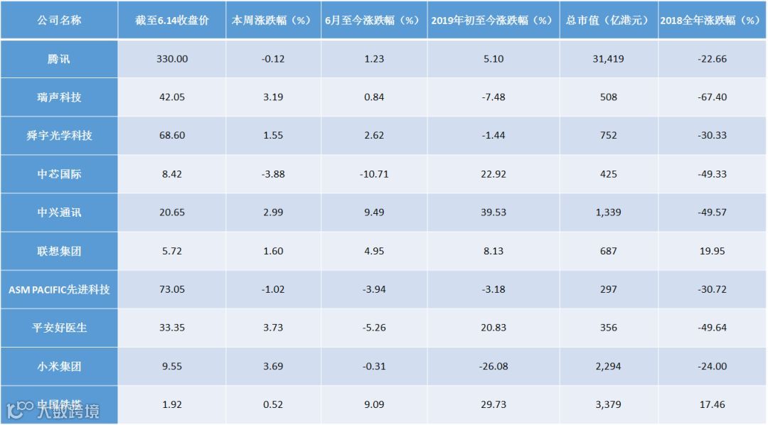 对于跨市场相关上市公司,我们分别从美股和港股市场,暂时选择了最具代表性的22只美股及10只港股,追踪其二级市场行情动态。