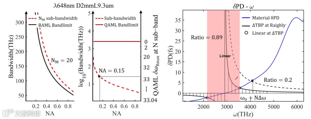 通过频率微扰,发现在设计频率之外,QAML同样保持了一定的子带宽的消色差能力。而当设计频率越多时,这些子带宽的总带宽会逐渐超过BAML的理论极限。而通过色散微扰,团队对非线性相位-频率响应的影响进行量化。在考虑材料色散影响下,得到了红色矩形所示的线性阈值范围。