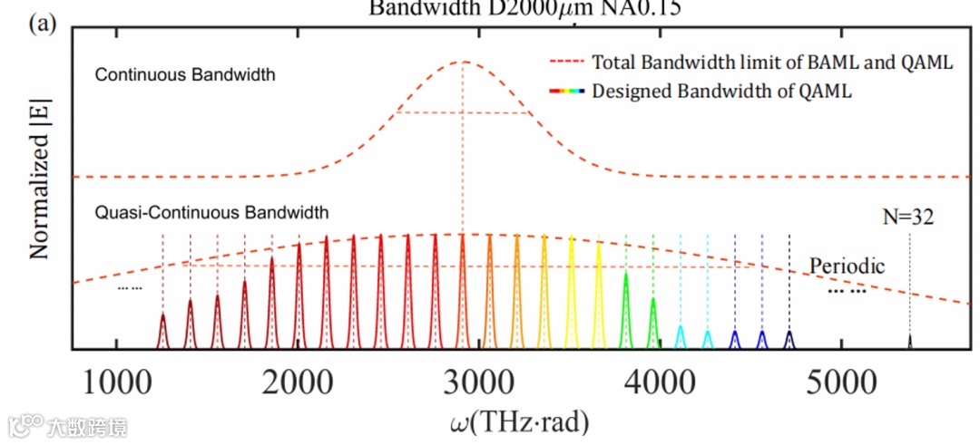 此时,PD的要求变为了一个和D和NA均无关的常数,因此色散的大小要求和口径,NA的约束关系不再成立。意味着QAML可以在有限的厚度范围内实现远超BAML的极大口径和极高NA。这种在准连续频率点下,通过PD延拓补偿色散的消色差超透镜称之为准消色差超透镜,用以表征其等间隔频率消色差的特征。