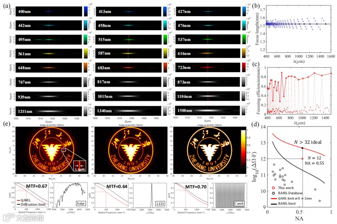 基于光谱分析,团队进一步利用仿真验证了QAML的可行性。对口径D=2mm,NA0.55,带宽范围400-1500nm的高性能QAML进行了电磁场模拟,证明了其在不同入射光谱下保持了高MTF成像性能。