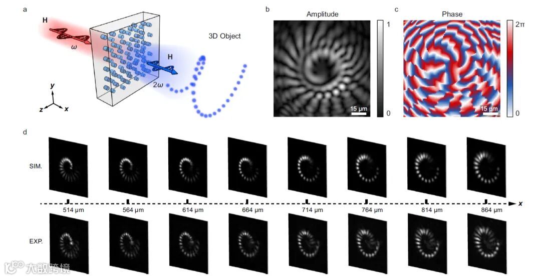 图2三维全息图像的非线性重构。a二次谐波复原三维图像示意图。b-c非线性全息图振幅和相位分布。d二次谐波图案沿传播方向分布的模拟和实验结果。