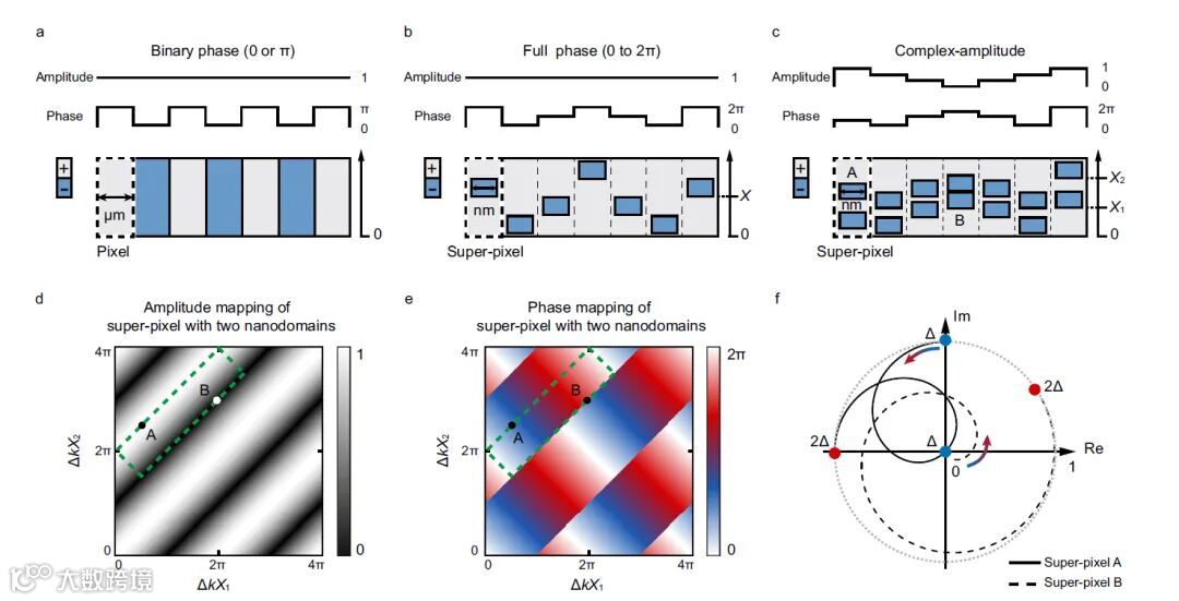 图1 纳米畴构建超像素结构示意图。a-b分别为二维非线性光子晶体中的二值化相位调控、超像素连续相位调控、超像素复振幅调控示意图。d-e分别为超像素调制振幅和相位与结构参数的映射关系。f为超像素调制复振幅在随相位失配变化在复平面的演化路线。