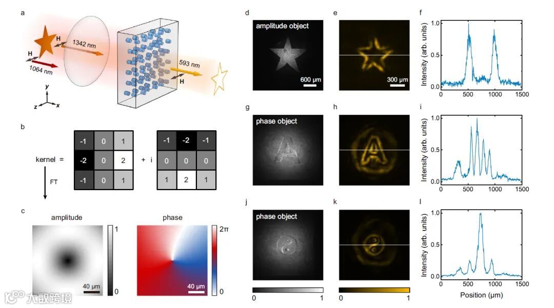 除了光学图像信息的重构,研究人员还利用高分辨复值非线性全息图进一步拓展了其跨波段光学信息处理的能力,通过非线性全息图传递和处理不同波段中的光学信息,能够避免在特殊波段中调制和探测的困难。研究人员首先实验演示了红外不可见图像的跨波段边缘增强,功能示意如图3a所示,图像由波长为1342 nm红外光照明,经傅里叶变换后与1064 nm的基频光一同输入非线性全息图(图3b-c),信息经过复振幅调制同时被转换至593 nm可见光通道实现边缘增强卷积运算。实验中对不同的振幅和相位物体的红外图像分别进行验证,从获得的可见光图像可以看到边缘增强的效果(图3e,3f,3k)。