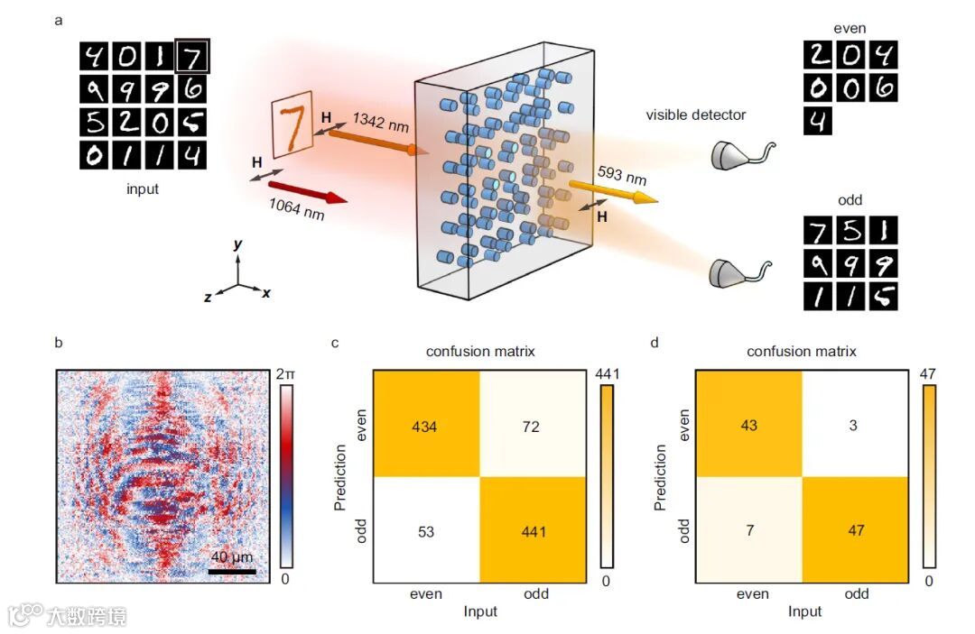 图4 基于频率上转换的手写数字分类。a上转换光学衍射神经网络对手写数字的奇偶分类示意图。b非线性全息图相位分布。c-d分别为数值和实验结果。