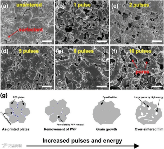 图3. a)未烧结样品和 b–f)烧结 Bi2Te2.7Se0.3 样品在 5.1 kW cm−2功率密度、1.5 ms脉冲持续时间和 362 ms脉冲延迟时间(1、2、5、8和10个脉冲)下的 SEM 图像。比例尺为 1 µm。g) 脉冲烧结微观结构演变示意图。