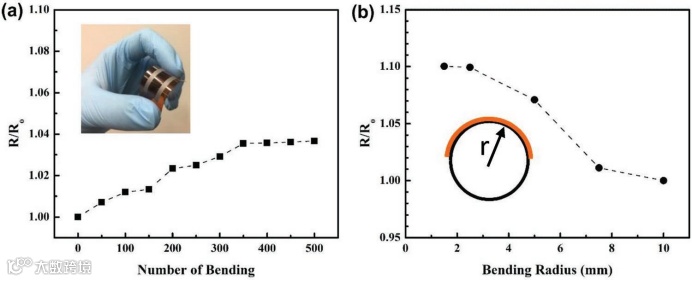 图4. 聚酰亚胺上光子烧结 Bi2Te2.7Se0.3 薄膜的机械性能 a)增加弯曲次数的弯曲试验,b)基于不同半径的弯曲试验。R0 和 R 分别是弯曲之前和之后的电阻。