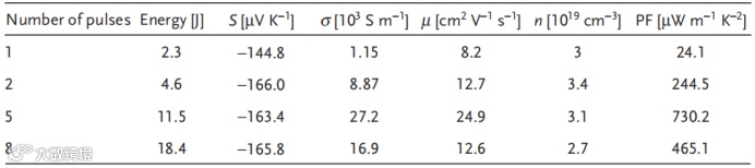 表2. 在 5.1 kW cm−2功率密度、1.5 ms脉冲持续时间和 362 ms脉冲延迟时间下,不同脉冲数的光子烧结膜的室温 TE 和载流子输运特性,包括塞贝克系数(S)、电导率(σ)、载流子迁移率(µ)、载流子浓度(n)和功率因数(PF)。能量 J 是在烧结过程中入射到打印膜表面上的能量的总量。