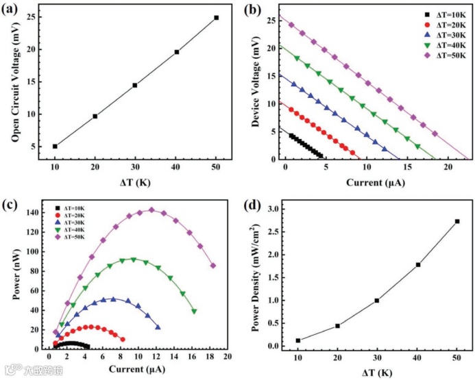 图5. 使用 Aerosol Jet 打印 Bi2Te2.7Se0.3 薄膜制造的柔性TE器件的性能:a)开路电压与温差(ΔT),b)器件工作电压与在不同 ΔT 下测试的电流,c)功率输出与在不同 △T 下的电流,d)在不同 ΔT 下测试的电功率密度。