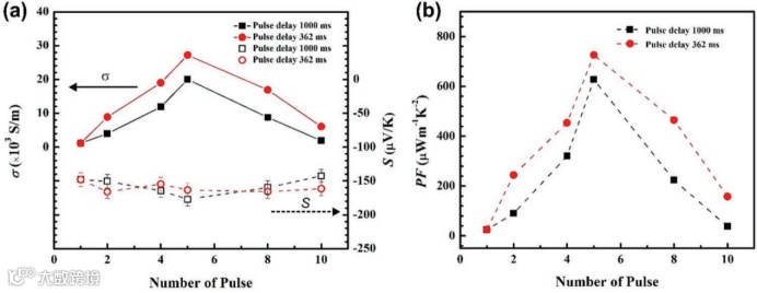 图2: a)电导率 σ、塞贝克系数 S 和 b)功率因数(PF)是在 5.1 kW cm−2的优化功率密度、1.5 ms的脉冲持续时间和 1000 和 362 ms的两种不同脉冲延迟时间下烧结的样品的脉冲数量的函数。