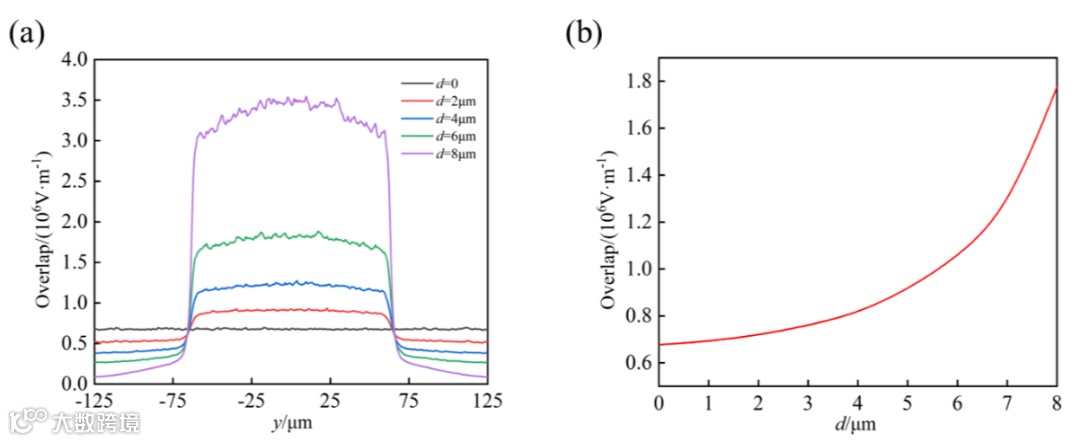 最后,为了探究调制微波的慢光效应对于LiNbO3波导的线性电光效应强度大小的影响程度,需要合理地对不同结构参数器件的结果进行对比,定义G=g+d,保持G=11 μm的大小固定不变,分析不同d的器件结构所展示的物理效应。在相同的频率f=220 GHz时,d增大对应的群速度先缓慢后急剧减小,因此金属锯齿宽度较大的结构对应的慢光效应更强。在发生线性电光效应的LiNbO3波导内部,慢光效应越强带来的调制微波场增强与局域效果越明显,在图3(a)中,展示了在单个周期性元胞内沿传播方向y不同位置处的电光重叠程度,慢光效应增强使得微波电场更加局域在金属齿的部分,槽部分的电场交叠程度则逐渐减弱。如图3(b)所示,三维空间中的电光重叠体积分因子随着d的增大而增大,与无周期单元结构的直波导调制器相比,调制效果显著,具体体现在当实现相同的相移量时,对于慢光效应越强的结构,所需要的传播长度越短,因此调制效率更高。并且,在满足器件更趋于集成化的同时,器件的总损耗值减小,增大了电光带宽,真正实现了兼顾低电压与大带宽的小型化调制器。