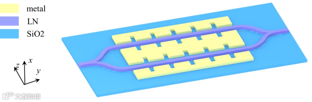 南京大学刘辉教授课题组提出了一种采用锯齿状的金属光子晶体作为电极的单片集成薄膜铌酸锂(LiNbO3)马赫-曾德尔干涉仪(MZI)电光调制器,其结构如图1所示,入射光通过Y结分为相同的两束进入到位于锯齿金属电极间隙中的LiNbO3波导,在外加微波场的作用下,通过发生线性电光效应使光波导模式的有效折射率发生改变,且由于在输出端的Y结处存在相位差,两束光发生相互干涉作用,从而实现对输出光信号振幅的调制。