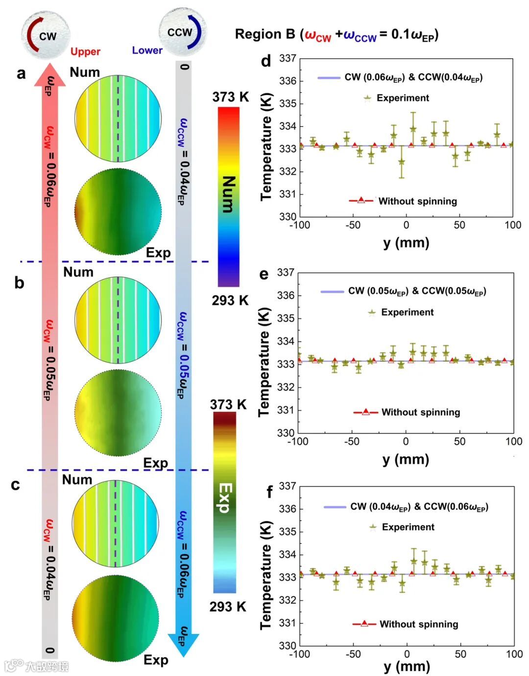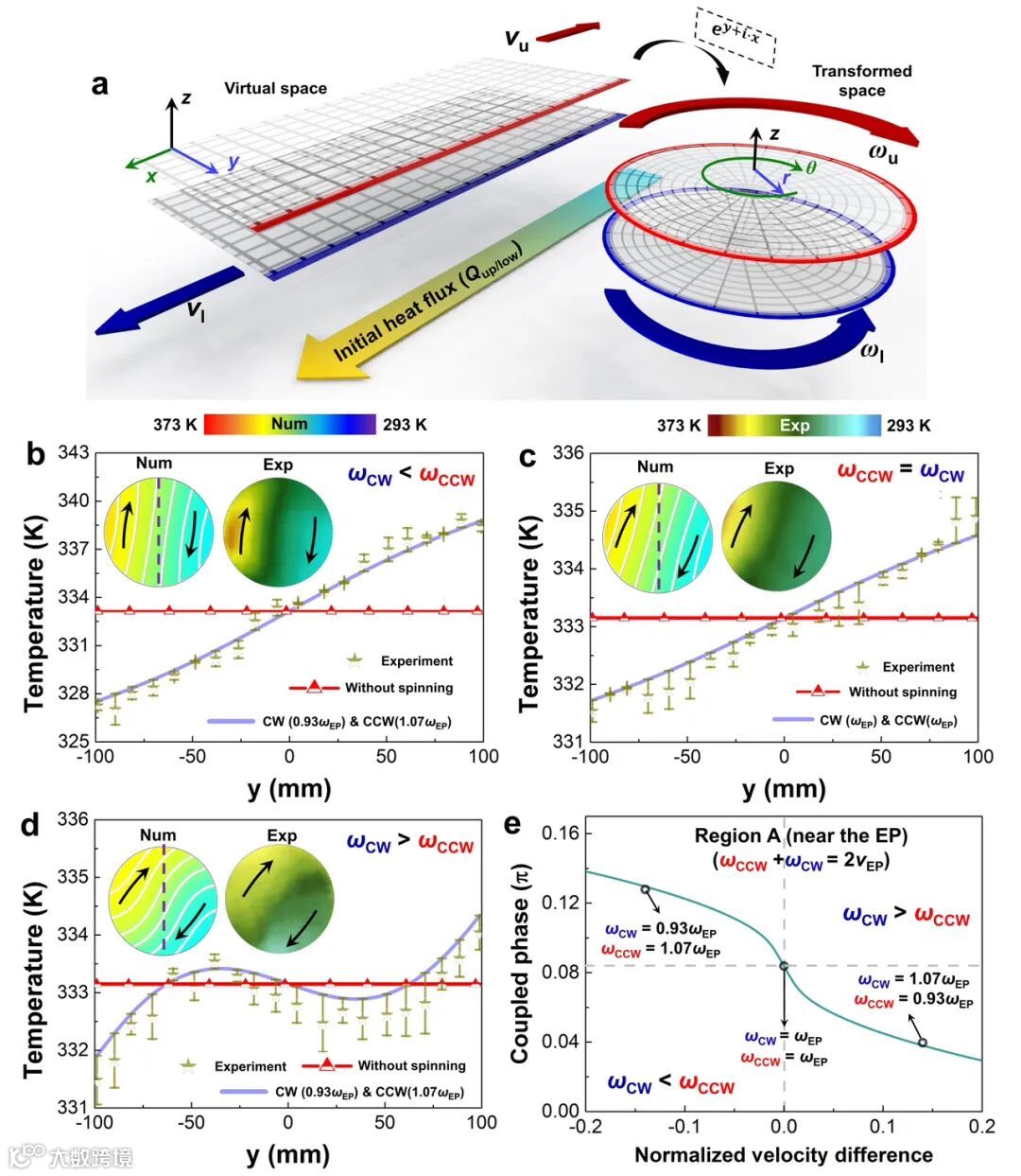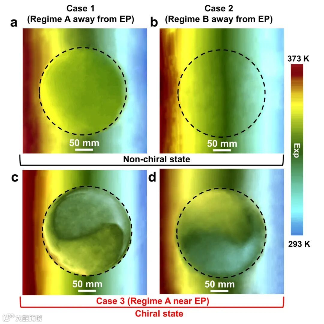 为了探究热流体系统潜在的手性,我们首先在笛卡尔坐标系中构建了一个流体区域。为了简化系统模型以及方便实验,我们进一步执行了一定的空间变换将热流体系统转换为具有旋转方向相反的柱状对流系统(图2a)。此时,上下两个子系统分别具有顺时针和逆时针旋转的对流,额外的恒定热源可以通过系统外的热源和冷源来进行施加。我们首先探究在区域A中的热场手性传输行为。此时,我们选取适当的对流强度来使得系统处于反宇称时间对称破缺相内,且在EP附近。从图2b~d中能够看出,无论对流强度如何配置,温度场的偏置方向均相同但偏置程度会有差异(图2e)。此时,热流体系统中的上下子系统的特征向量会形成较大差异,使得整体系统呈现出一定的手性特征。