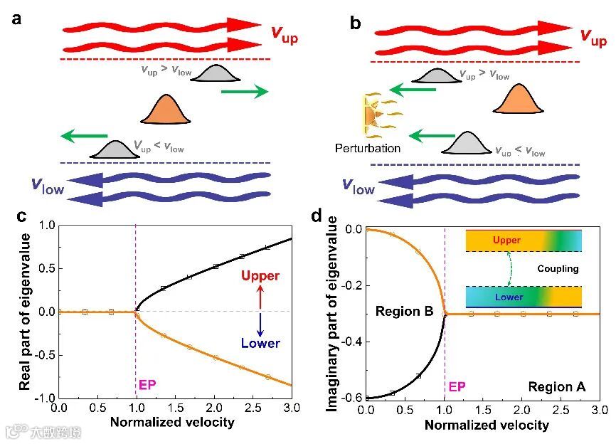 的上部分和下部分,以及作为恒定热流所引入的全局热扰动。在这里我们发现,不同于以往在非厄米热系统中构建EP的研究,所引入的两个反向对流的强度不需要完全相等,而是只需要满足对流的平均强度能够匹配系统换热耦合即可。通过求解该系统的本征值(图1c和1d),我们发现此时热流体系统仍符合反宇称时间对称性。进一步围绕系统EP以及平均对流强度与耦合换热间的关系,我们可以将系统分为2个区间:包含反宇称时间对称性破缺的区间A,以及具有反宇称时间对称性区间B。