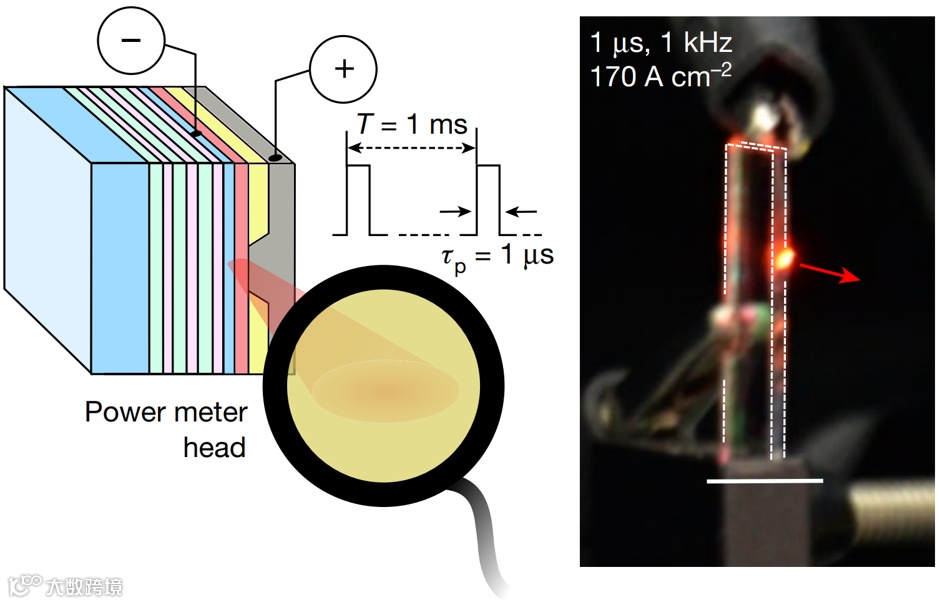 一个典型的胶体量子点发光二极管的工作电流密度通常不超过1安培每平方厘米;而要实现电泵激光,则需要几十安培甚至几百安培每平方厘米的电流密度,这通常会带来严重的发热问题,甚至使器件损毁。