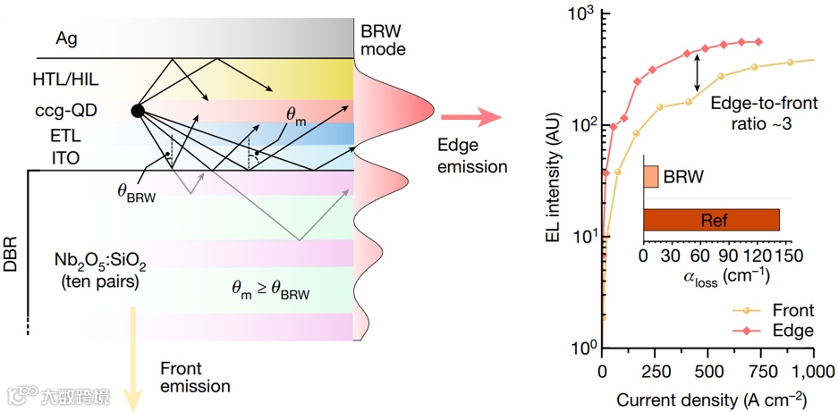 为有效降低光学损耗,研究团队增加了分布式布拉格反射镜(Distributed Bragg Reflector, DBR)作为衬底,与顶部银电极共同形成了布拉格反射波导,有效地降低了传输层中的光场强度,从而降低传输层带来的巨大损耗。同时,量子点增益介质中的光场强度得到了增强,以增加模式增益。