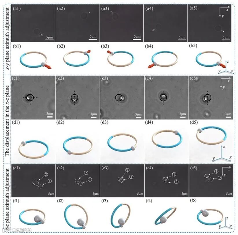 为了验证多维度操纵的能力,研究者设计了一系列实验。首先对两端不对称的酵母菌细胞进行x-y平面的旋转操纵如图3(a1)-(a5)所示,实验结果表明酵母菌较大的一端始终朝向外侧,与预期相符。第二个实验是在实验一的基础上附加上沿z轴的位移,此时粒子的轨迹是一个三维螺旋线;从实验图中可以看出,粒子很好的跟随着光束进行了运动。第三个实验是针对复杂粒子,因此选取了一大一小两个黏着的酵母菌细胞进行实验,此时光束沿y轴旋转180°;从实验图中可以完整的看到小粒子从右下方到大粒子下方,再从下方移动到左上方的过程。该实验充分验证了六维光镊对粒子朝向的控制能力。此外通过光束旋转,六维刚体光镊的捕获范围也将随之扩大,如动图1所示。