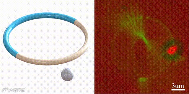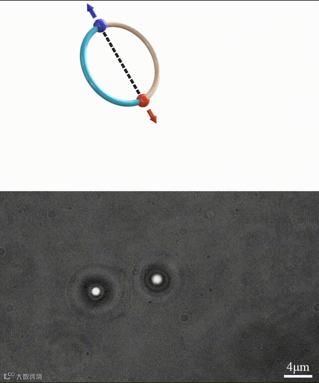 为了验证其他自由度操纵能力并体现六维刚体光镊的优势,他们同时捕获了两个粒子,并设计了一个更复杂的三维摆线轨迹,如动图2所示。为了实现这一目标,光束被修改为两个尖端(六维光镊的尖端的数量和位置是可任意定制的)。为了使3D模型更加清晰,他们将粒子分别涂成红色和蓝色来突出它们的位置,并添加两个相同颜色但方向不同的箭头来指示方向。显然,被捕获粒子的轨迹与给定三维模型的路径很好地吻合。值得注意的是如此复杂的运动轨迹,不论是使用现有的全息光镊法,还是光束塑形的方式,都需要根据轨迹对光束进行重大调整。而这种刚体操纵的最新方式,六个独立自由度对应了六个相互独立且可任意调控的参数,只需要设置相应的参数即可得到对应的自由组合出来的运动轨迹,这大大简化了光镊设计。