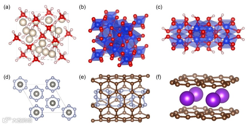 图3:MAGUS的一些代表性成果。(a) 巨行星内部的氦-水化合物 ; (b) 二氧化硅混合配位高压相; (c) 二氧化硅-水化合物 ; (d) 超硬的WN6化合物; (e) 碳纳米管中的氮纳米管 (f) 可剥离出层状超导T-graphene的C4K化合物。