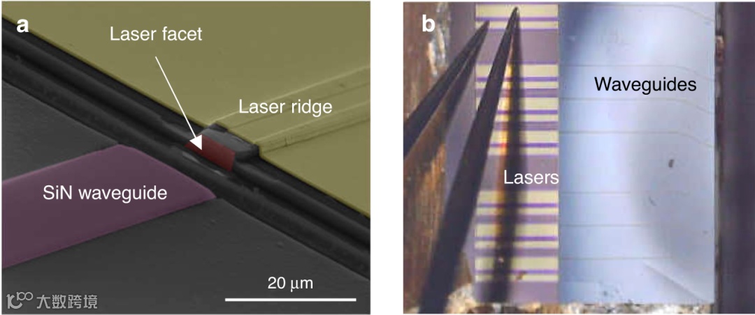 图3. a)SEM图像显示激光脊及其蚀刻面和无源波导。b)配备SiN波导的激光棒的图片,准备在探测站上进行测试。DL长1.5毫米。