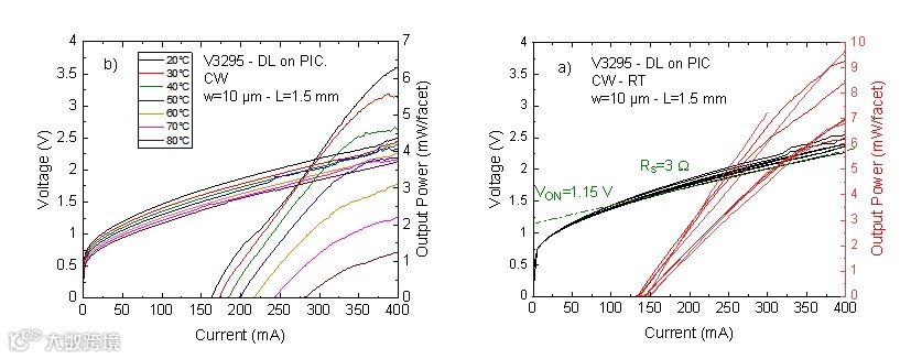 图4. 硅基PIC上DL的L–I–V特性。a)8个DL在室温下CW状态下的L-I-V曲线。b) 对于典型DL,在20 °C和80 °C之间的不同温度下拍摄的L-I-V曲线。