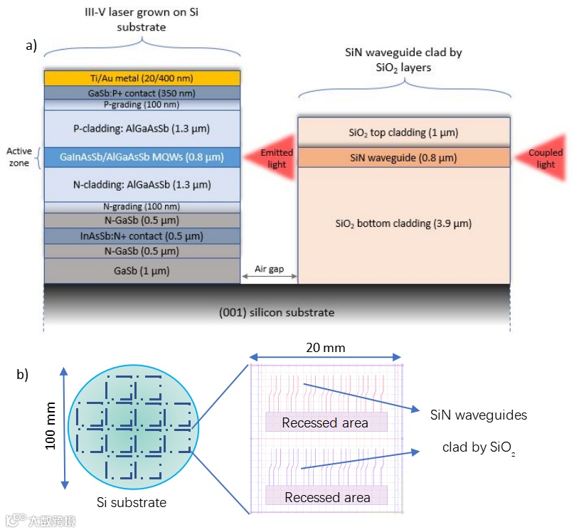 图1. 集成设备概述。a) 最终器件的横截面示意图:外延集成III-V族激光器的有源区发射的光耦合到SiN波导中。b) 实验中使用的硅光子学PICs示意图:首先处理100毫米的硅晶片,形成由SiO2层覆盖的SiN波导。图案按20x20 mm²的正方形排列。然后将电介质堆叠向下蚀刻到Si衬底,以打开III-V激光器将外延生长的凹陷区域。然后对晶片进行切割,得到用于外延的20x20 mm²的切片。