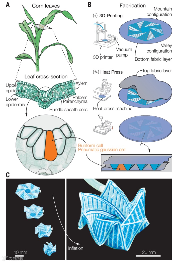 近日,法国巴黎城市大学Benoît Roman团队受单子叶植物叶片中泡状细胞的启发,展示了如何设计平板的内部结构,以便在加压时同时编程弯曲和面内扭曲,从而形成目标的外壳形状。玉米等单子叶植物的叶片在干燥条件下能够可逆地向内卷曲,从而限制蒸发。其驱动力依赖于奇特的泡状细胞,这些细胞会根据膨压改变其体积,从而使表面叶片的一侧产生平面内的伸展或收缩。受这个来自大自然的例子的启发,文中设计了内嵌充气式单元的薄面板,称为气动高斯单元。面板的面内收缩和角度偏转都可以通过单元的设计同时编程,从而产生刚性的3D结构。这个定性的步骤构成了多功能变形机器人应用的重要里程碑。相关研究发表在《Science》上。(徐锐)