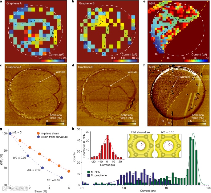 总之,实验表明,在其他无缺陷的二维晶体中,应变诱导的形态特征与周围质子传导性的增强有关。石墨烯皱皱就是一个明显的例子,它不需要任何晶格缺陷,却能产生高质子电流,这与 CVD 石墨烯中的晶界情况并无二致。他们的研究结果还表明,纳米级波纹在二维膜中普遍存在,而且已知会产生相当大的应变,它能加速名义上平坦区域内的质子传输。这一点非常重要,因为石墨烯通常被模拟为完全平坦的非应变晶体。由于二维膜中的应变和曲率通常可高达 10%,理论预测平直无应变石墨烯的 E0 可高达 1.5 eV,这似乎与实验报告的约 1.0 eV 的势垒相符。最后,可以利用应变和曲率来增强二维晶体的质子传导性,这对涉及质子传输的各种应用都很有意义。