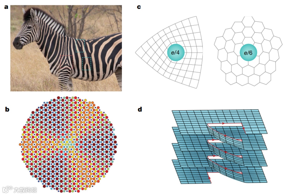 图5. 拓扑缺陷。(a)斑马条纹中的拓扑旋错(红框)和位错(蓝框)。(b)在声学系统中基于Kekulé结构涡旋构造的声学Jackiw-Rossi型拓扑缺陷。(c)基于四方和六角晶格形成的拓扑旋错分别携带以e/4和e/6为单位量的分数电荷。(d)通过切割-粘合二维堆叠拓扑绝缘体形成的三维螺旋位错。
