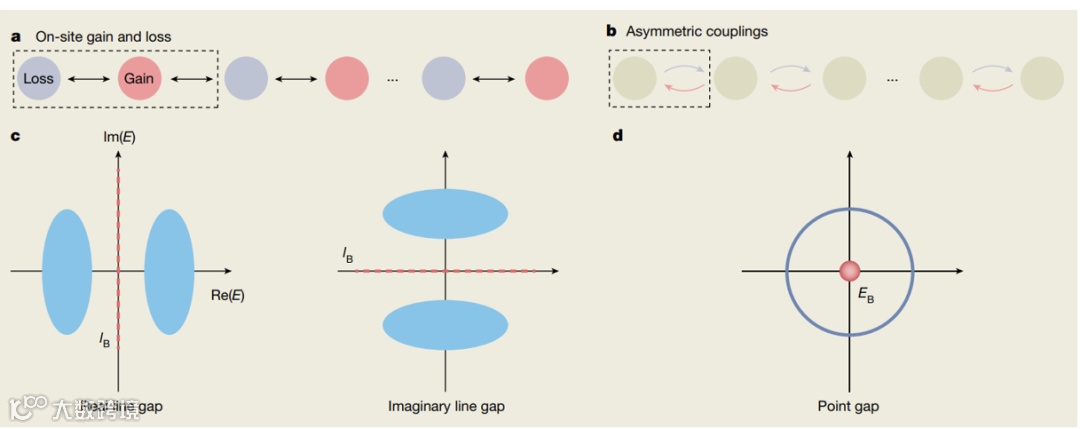 Box. 非厄米带隙。考虑两种周期性格子,其非厄米性分别来源于原位增益/损耗(a)或者非对称耦合(b),前者会出现线带隙,可进一步分为实带隙和虚带隙(c),后者出现特殊的点带隙(d)。