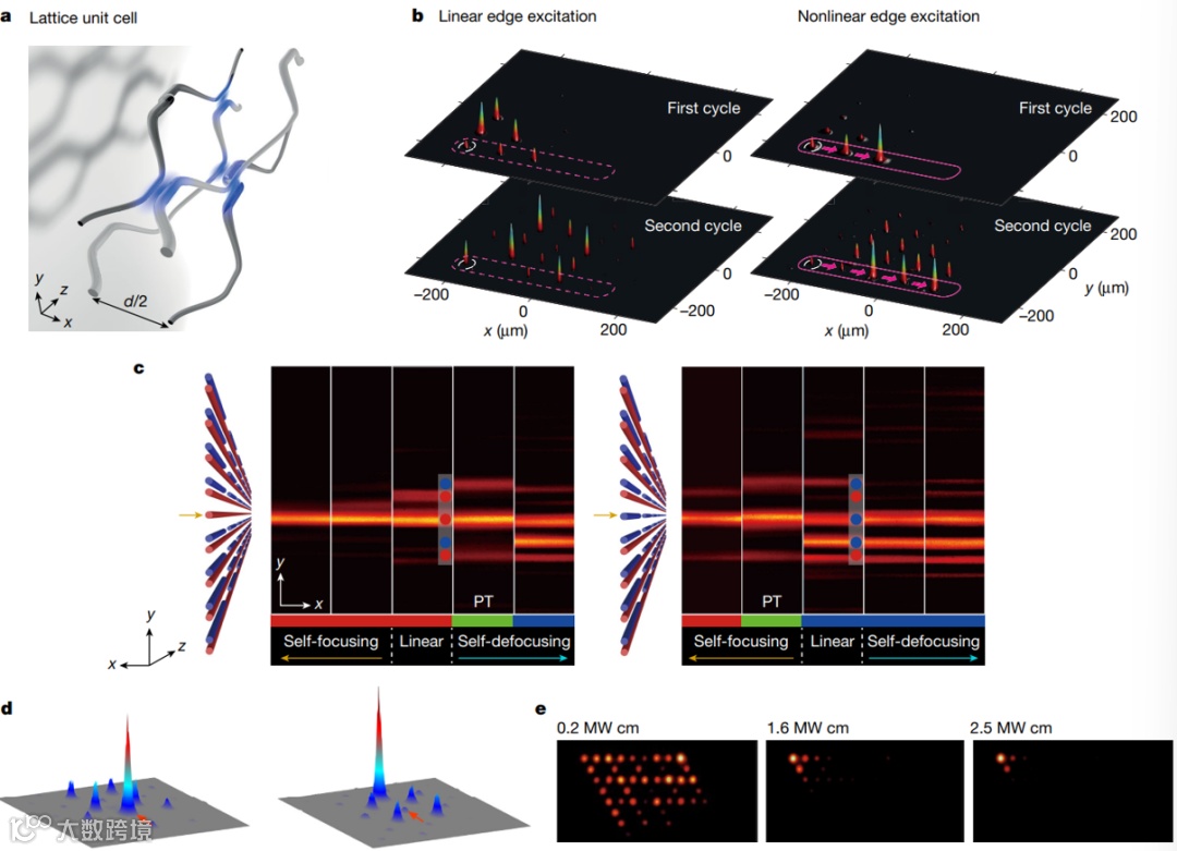 图3. 非线性拓扑结构。(a)二维非线性光学拓扑绝缘体,其非线性是基于具有失谐折射率的耦合光波导予以实现。(b)在低功率状态下,光衍射到晶格内部;对于高输入功率值,系统发生拓扑相变,变成拓扑非平庸相,出现手性边界通道。(c)基于耦合光波导的非厄米拓扑SSH模型,其中非线性控制系统的增益和损耗,使其在PT对称和非PT对称状态之间切换,并伴随着具有增益(左)和损耗(右)界面的拓扑零能模式的破坏和恢复。(d)沿Floquet 拓扑绝缘体的边缘形成的光孤子波。(e)在二阶拓扑绝缘体的拐角处形成非线性引起的角态。