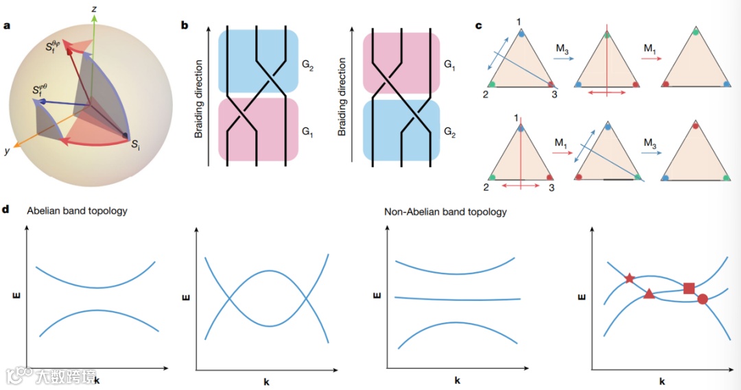 图4. 非阿贝尔波动物理,算符的不可交换性形成了非阿贝尔结构。(a)SU(2)群,其中含时调制和法拉第效应分别对应两个旋转算符。(b)编织群,其中沿着某些参数循环的状态演化表现为编织算子。(c)置换群,其中在非厄米系统中交换的本征态表现为置换算符。(d)与阿贝尔拓扑不变量表征的双带模型相比,具有实本征态的多带模型涉及到非阿贝尔能带拓扑,图中符号表示由非阿贝尔群元素表征的能带节点。