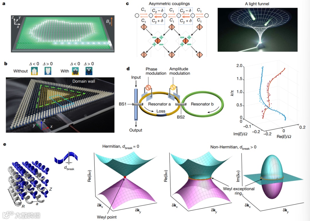 图2. 非厄米拓扑现象。(a)光学拓扑激光器。(b)声学非厄米拓扑微腔。(c)在具有不对称耦合和非厄米点带隙的系统中实现非厄米趋肤效应。(d)在光学系统中,基于振幅和相位调制器实现非厄米复能带的编织。(e)将散射损耗引入光螺旋波导阵列中,原本无损耗时的厄米外尔点扩展成了非厄米的外尔奇异环。