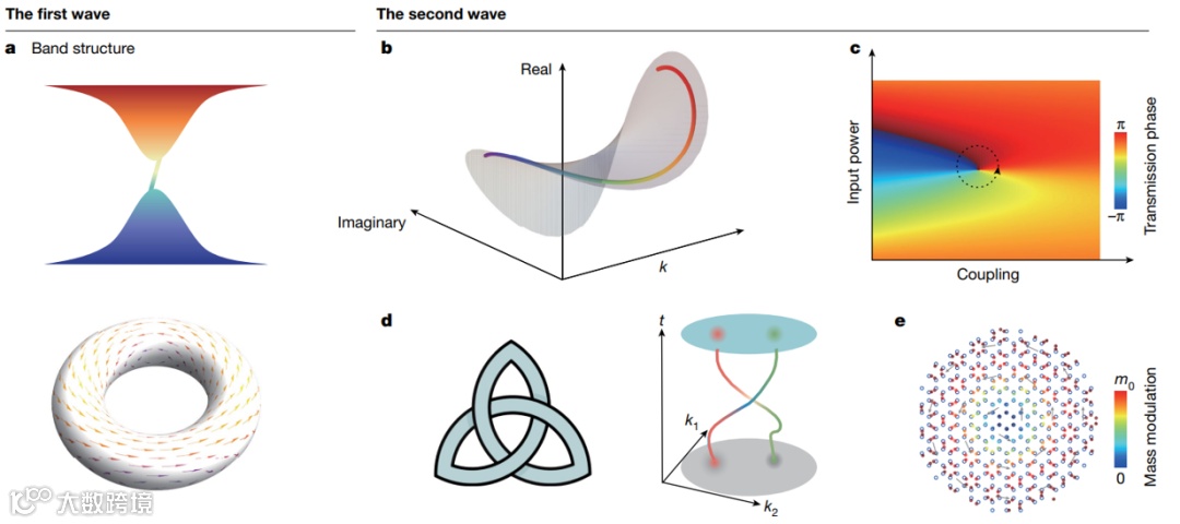 图1.(a)常规拓扑绝缘体的典型能带结构(上),其拓扑性质通常用非平庸的贝里曲率(下)来表征。(b)与常规拓扑系统不同,一些非厄米系统中的拓扑性质需要由复能带绕组(complex energy winding)来表征。(c)非线性系统中随着系统输入功率的增加,能带结构无法准确定义,此时系统的拓扑性质可通过分析传输相位及其绕组行为来进行表征。(d)三叶结绳结结构(左)、和能带节点组成的编织结构(右),可以都用基本群 (the fundamental group) 来描述,在特定的结构间还具有一定的等价性。(e)涡旋缺陷,其拓扑性质源自于实空间中的结构扭曲,无法用倒空间的能带性质进行描述。