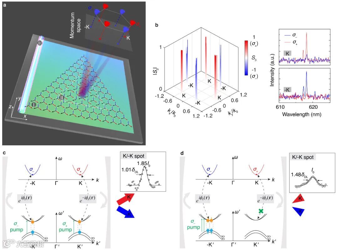 另一方面,作者采用了一个直接带隙的过渡金属硫化物单层作为自旋偏振光源的增益材料。这种二维材料具有空间反演对称性破缺的原子结构以及电子自旋-轨道相互作用,因此具备一个独特的自由度 – ±K'能谷。这种信息载体在新一代谷电子学器件中拥有巨大的应用前景,近年来得到了广泛研究。具体地,利用能谷依赖的光学选择定则,±K'能谷激子可以通过右旋和左旋圆偏光进行选择性激发,从而赋予自旋偏振光源在无外加磁场条件下的有源操控能力。