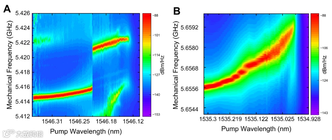 进一步地,该团队使用蓝失谐光场给声学模式提供的增益最终将导致声子激射现象的出现,系统将进入光声同步态。由于奇异点附近声学本征值随系统参数演化的独特的拓扑面特性,取决于奇异点和激射区域的相对位置,光声同步态可以从拓扑面的上表面连续演化或者跳变至下表面。图3展示了光声同步态所对应的声学谱随泵浦激光波长的演化的两种情况。