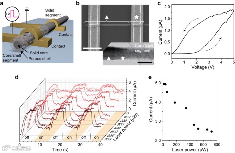 纳米颗粒网络的独特特性可以通过多孔硅结构来实现。记忆装置是通过合理设计一个具有固体核心和多孔壳结构的单一硅晶圆来具体实现的,如图2a所示。为了制造具有两个结构不同段的纳米线器件,研究人员使用了金属辅助化学蚀刻,如图2b的纳米线结构的扫描电子显微镜图像所示,左边和右边的电极分别是在长的固体段和短的芯/壳段上制作的。