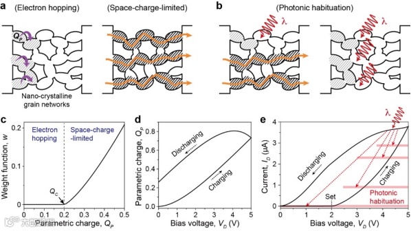 研究人员利用纳米晶体网络,以可逆的方式控制持久的电流路径,而无需结构变形,如图1a和1b所示。由于许多纳米晶粒是相互连接的,这样的网络具有很高的电阻;然而,电荷可以形成具有较低电阻的电流渗入路径。事实上,由于纳米晶粒的自电容性质,电荷被储存在网络中。随着电荷的增加,电流流动过程从电子跳跃变为空间电荷限制的过程(图1a)。可以看出,电子跳动的电流比空间电荷限制的电流低得多,这是由于渗滤路径中的电连接是由带电的纳米颗粒网络完成的,而跳跃过程需要激活能来克服库伦屏障。因此,通过调整电子跳动和空间电荷限制,模拟控制持久性电流水平是可行的。
