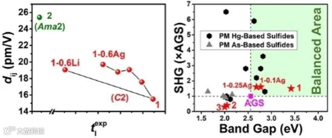 在高性能红外非线性光学硫族化合物中,由于关键参数(如带隙(Eg)和二阶谐波产生(SHG))的强相互耦合甚至相反的变化,导致了高性能红外非线性光学硫族化合物的极端稀缺性。研究团队报告了8种新的硫化物,Na2Ba [(AgxNa1-x)2Sn2S7],x = 0.1系列,x = 0.1-0.6; Na2Ba [(Li0.58 Na0.42)2Sn2S7] ,1-0.6 Li) ; Na2Sr [ Cu2Sn2S7] ; 和 Na2Ba [ Cu2Sn2S7]。研究人员使用结构容忍因子来连接化学成份、晶体结构和非线性光学特性。在这些相关性的指导下,Eg 和 SHG 之间实现了更好平衡,其表现出3.42 eV 的大 Eg 和优异的 NLO 性质(SHG: 1.5 × AGS; 激光诱导损伤阈值: 12 × AGS) ,代表迄今为止已知的无汞或无砷硫化物中的最佳性能。