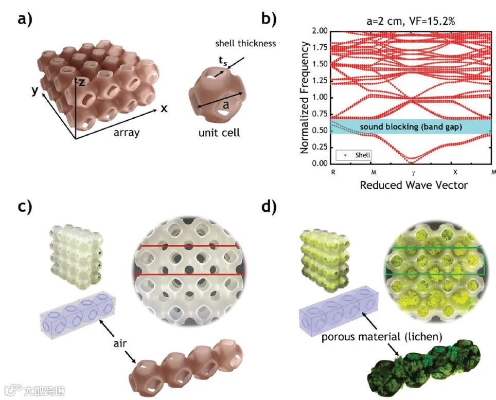 近日,韩国科学技术院(KAIST)Il-Kwon Oh教授团队,设计了一种新型的仿生和亲生物的地衣—施瓦茨超材料(SLSM)设计,该超材料在噪音衰减和湿度控制方面实现了多功能特性。SLSM将经过隔声设计的三重周期最小表面与自然界中生长的植物地衣相结合,声学超材料不仅可以实现宽频隔声也为地衣的生长提供了外壳和外骨骼,其内部生长的地衣可以在干燥脆性状态和湿润弹性状态之间转化,可以控制环境的湿度,并且这种植物可以在更宽的频带范围内提供更佳的隔声性能。这种人工结构与植物共生的多功能声学超材料可以实现噪声与湿度的双重控制,为实现绿色、生物友好、可持续发展的建筑材料提供了新的方案。相关工作发表在《Advanced Functional Materials》上。(刘帅)