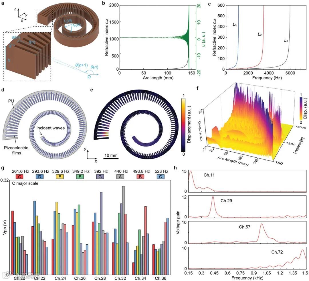 近日,华中科技大学臧剑锋教授团队提出了一种仿造人类耳蜗形状和关键功能的仿生软弹性超材料。受人类耳蜗的启发,该超材料被设计成具有分布在螺旋形状上的梯度微结构,具有很高的有效折射率,可实现与位置相关的频率解复用,10倍的声音被动增强效果,以及168通道声音/压电信号的高速并行处理。此外,使用这种超材料制造的自然听力人工耳蜗的频率分辨率高达30 Hz,可适用于150-12000 Hz的宽频范围,并产生可有效激活小鼠的听觉通路的输出电压。这项研究为重度听力损失患者自然听力的重建带来了新的希望。相关研究工作发表在《Advanced Science》上。(李治含)